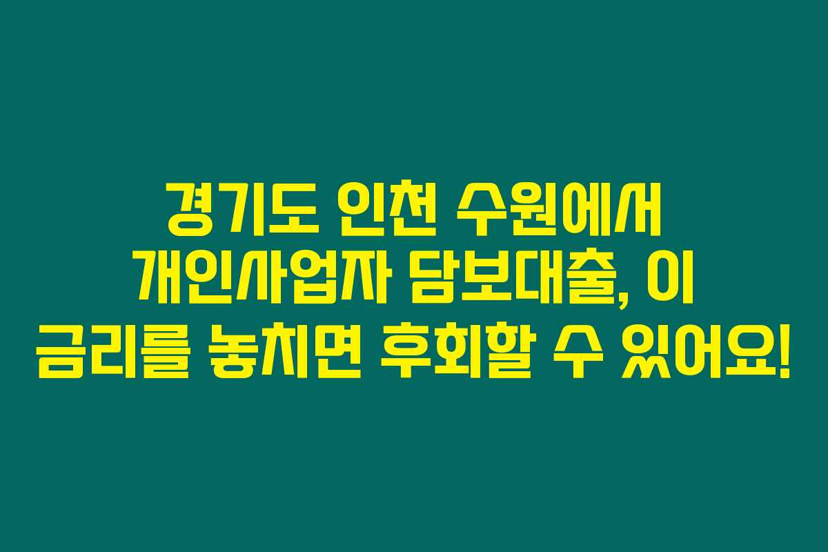 제가 알아본 바로는, 경기도 인천 수원 지역에서 개인사업자담보대출은 지금이 유리한 시점이에요. 대출 한도가 최대 95%까지 가능하다는 점과 현재 저금리로 제공되는 특판 상품이 있다는 사실은 정말 놓치기 아쉬운 정보라고 생각해요. 아래를 읽어보시면, 구체적인 대출 조건과 한도, 금리 등에 대한 내용을 통해 왜 지금 대출 신청을 고려해야 하는지 명확히 아실 수 있을 거예요.