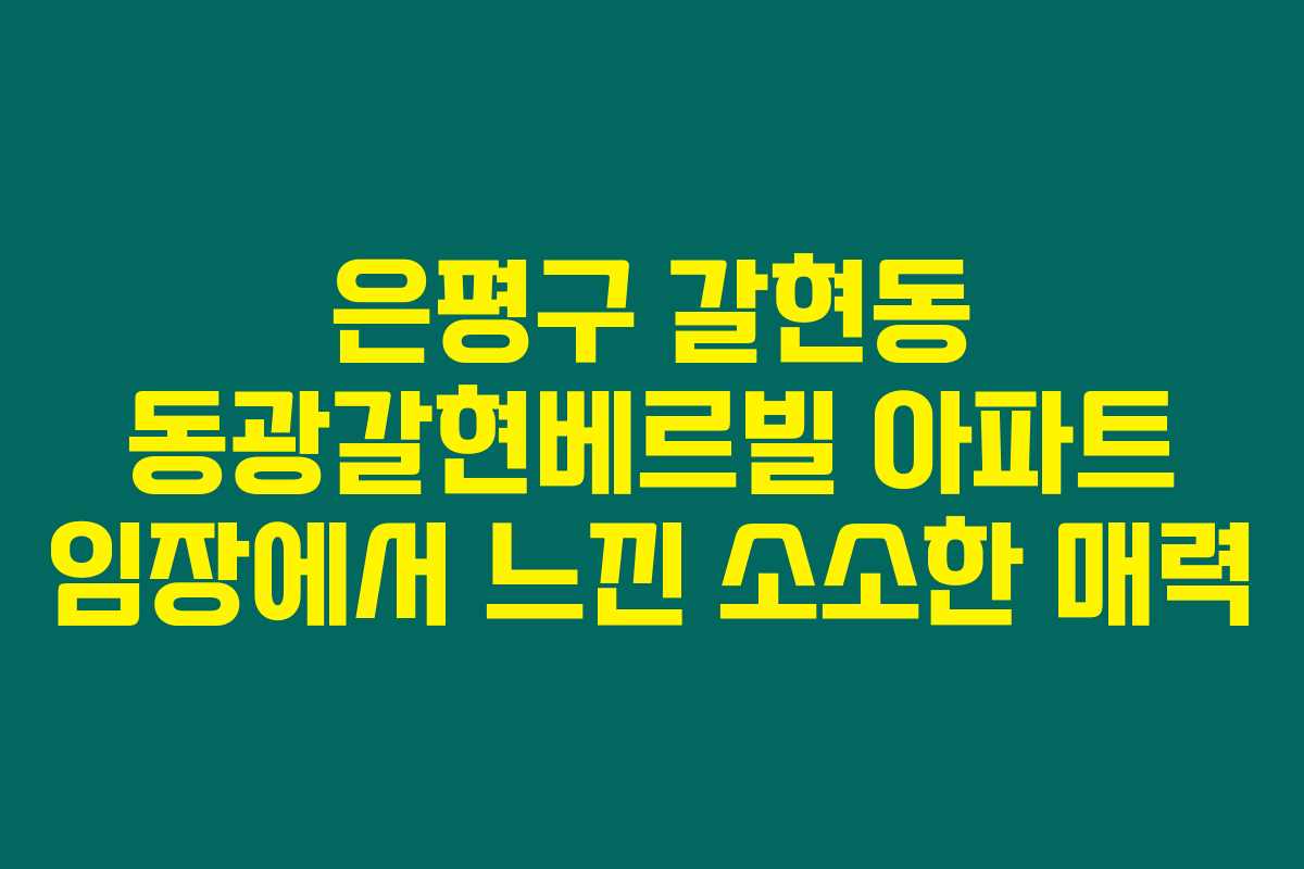 제가 직접 경험해본 결과로는, 은평구 갈현동에 위치한 동광갈현베르빌 아파트는 교통과 교육 환경이 조화롭게 어우러진 매력적인 아파트입니다. 초역세권과 학세권이라는 두 가지 큰 장점을 갖춘 이곳에 대해 제가 알아본 내용을 아래를 읽어보시면 더욱 자세히 이해하실 수 있을 것입니다.