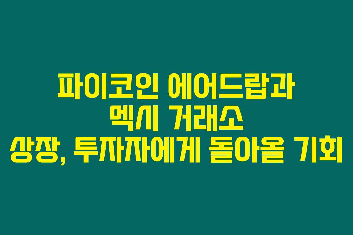 제가 직접 리서치한 바로는, 파이코인의 에어드랍과 멕시 MEXC 거래소의 상장 소식이 최근 많은 관심을 모으고 있습니다. 특히 이번 상장이 한국 시간으로 2025년 2월 20일 오후 5시에 예정되어 있어 더 많은 투자자들이 기대를 갖고 있습니다. 파이코인의 에어드랍은 기존 사용자에게 추가 가치를 제공하며, 이로 인해 파이코인의 인지도를 높이는 독특한 기회가 될 것입니다. 아래를 읽어보시면 여러분도 이 기회를 놓치지 않을 수 있을 거예요.