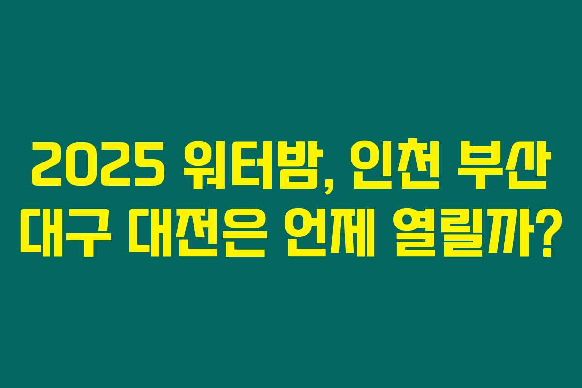 올여름 워터밤이 인천, 부산, 대구에서도 개최될 것에 대한 기대가 고조되고 있습니다. 공식 발표가 있기를 손꼽아 기다리며, 멋진 여름을 준비해보세요! 시원한 물놀이와 함께 흥미진진한 공연이 여러분을 기다리고 있습니다!