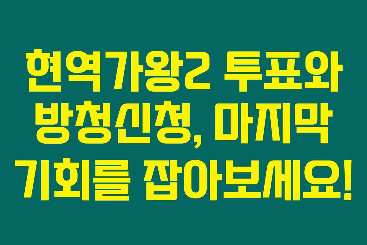 여러분의 소중한 참여가 결승전의 생명력을 더해줍니다. 지금 바로 현역가왕2 투표하기에 참여하고, 방청신청도 잊지 마세요!