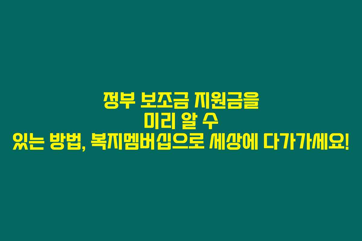 정부의 보조금과 지원금을 어떻게 알아보나요? 이 질문을 가지고 고민한 적 있으시죠? 요즘에는 많은 분들이 정부의 다양한 지원 혜택을 놓치고 있어요. 그래서 오늘은 그런 걱정을 싹 날려줄 복지멤버십을 소개할게요. 이 글을 통해 미리 알림도 받고, 필요한 정보를 챙겨보세요!