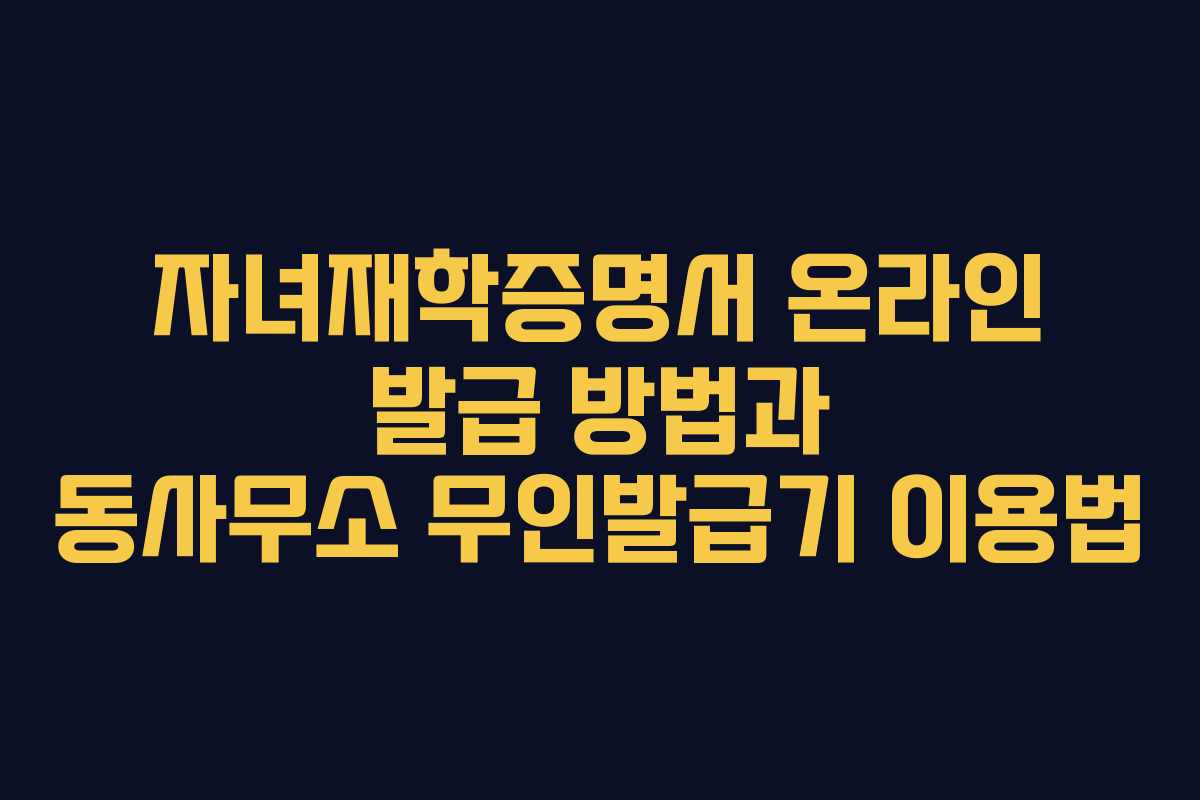 자녀재학증명서는 자녀의 교육적 필요를 위해 매우 중요한 서류입니다. 온라인 발급과 동사무소 무인발급기 이용 방법 모두 각각의 장점이 있으며, 상황에 맞게 선택할 수 있습니다. 발급받는 과정에서 필요한 정보와 서류를 미리 준비하고 유의사항을 잘 숙지하여 원활한 발급을 경험하시기 바랍니다.