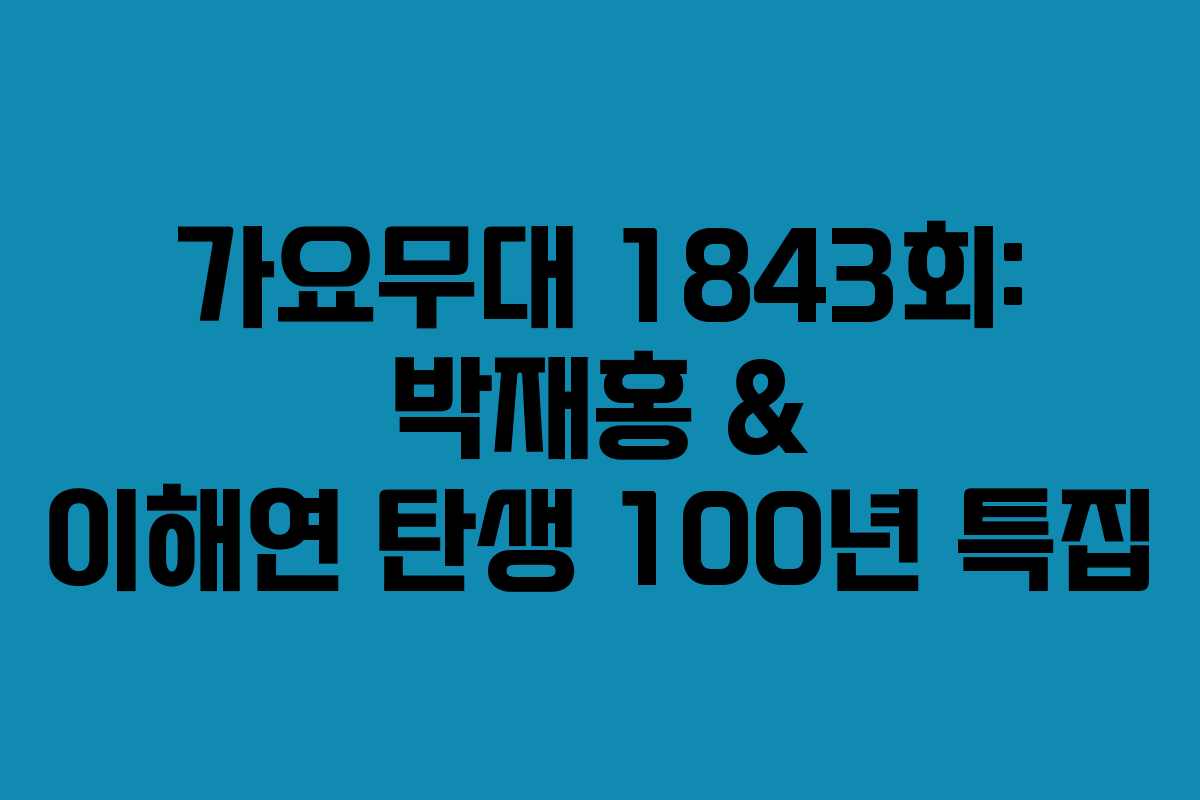 2024년 4월 1일 밤 10시에 방송되는 가요무대 1843회는 특별히 ‘박재홍 & 이해연 탄생 100년’을 주제로 진행됩니다. 다양한 가수들이 출연하여 풍성한 무대를 꾸미므로 많은 기대를 모으고 있습니다.