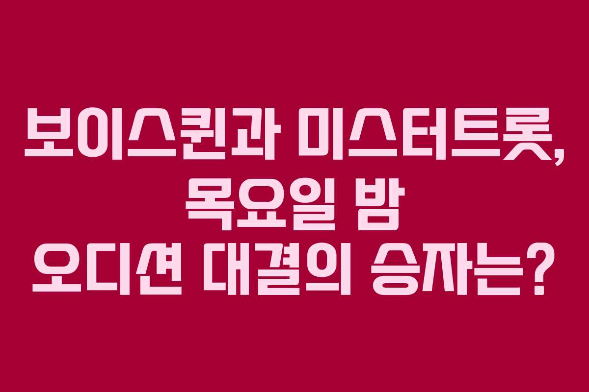 최근 MBN의 ‘보이스퀸’과 TV조선의 ‘미스터트롯’이 목요일 밤 오디션 프로그램으로 맞대결을 펼치고 있습니다. 두 프로그램 모두 높은 시청률을 기록하며 많은 시청자들의 관심을 받고 있는데요, 과연 이들 중 누가 더 강력한 모습을 보일지 살펴보겠습니다.